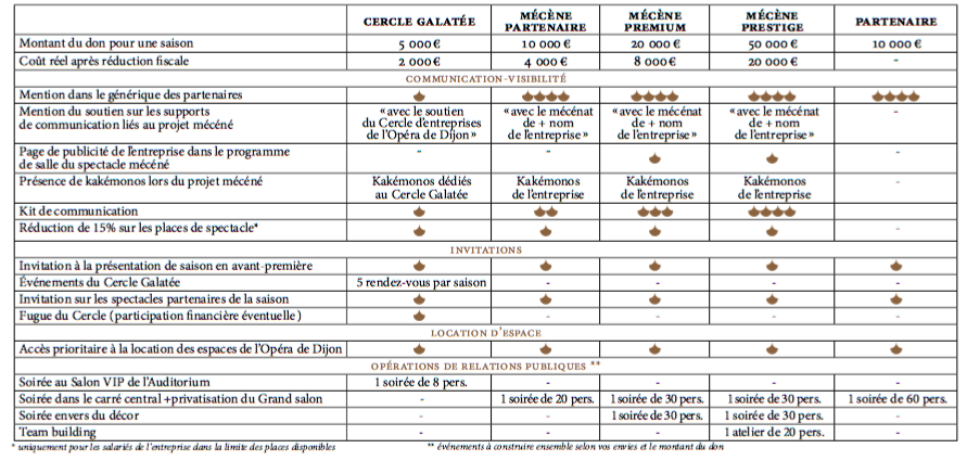 Depuis la saison 2014-2015, l’Opéra de Dijon a décidé de fédérer en une même entité les moyens et les ambitions de TPE et PME régionales en créant le Cercle Galatée, permettant ainsi aux entreprises de toute taille de participer collectivement à des actions de mécénat. Ce Cercle offre ainsi aux entreprises la possibilité d’affirmer leur vocation d’entreprises citoyennes, engagées dans leur environnement social et humain. Fonctionnant en véritable club affaires, il permet de créer des opportunités de rencontres et d’échanges.